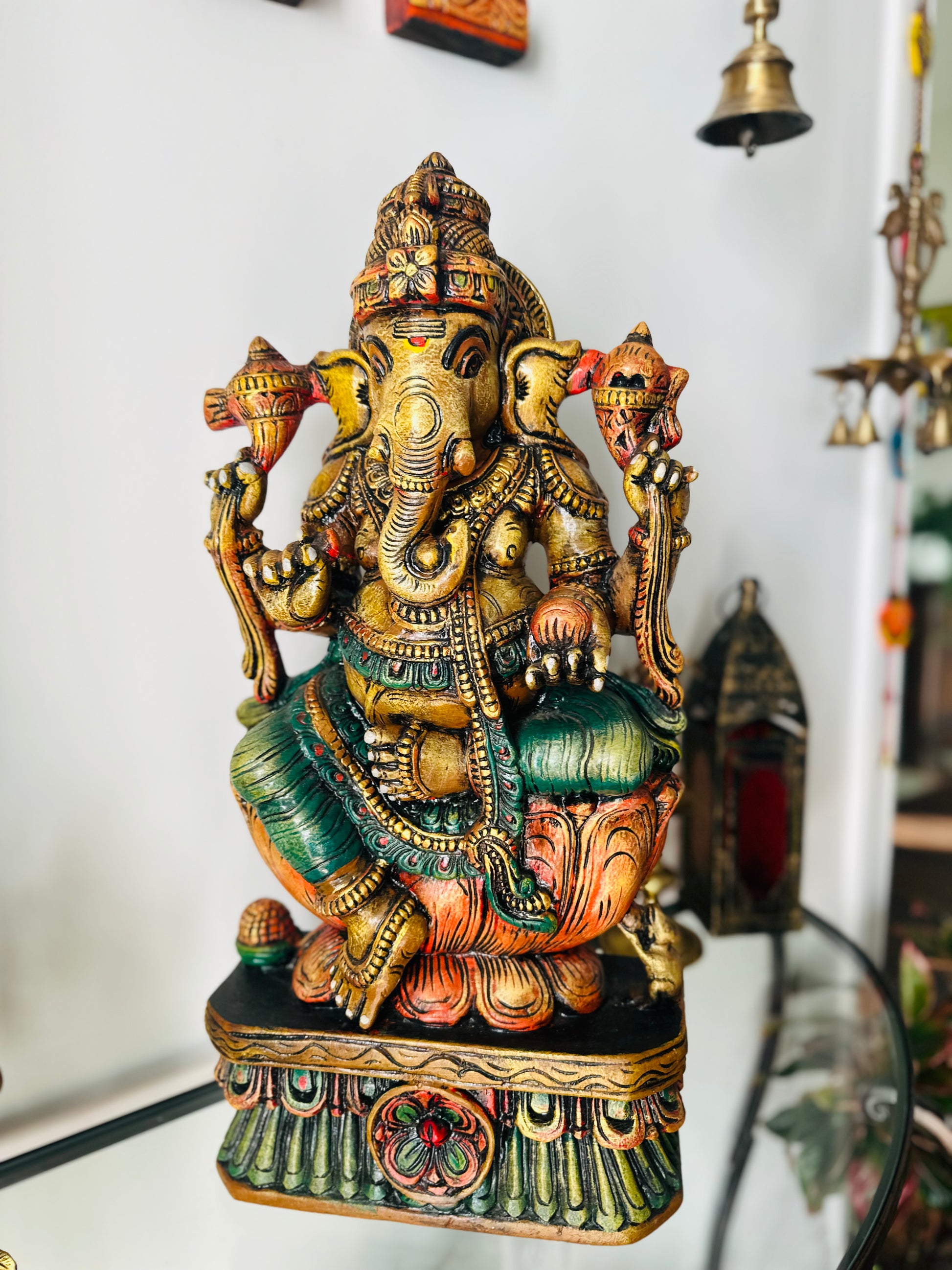 Infuse your home with divine energy and vibrant artistry through our Large 2ft Handcrafted Wooden Ganesha Idol.